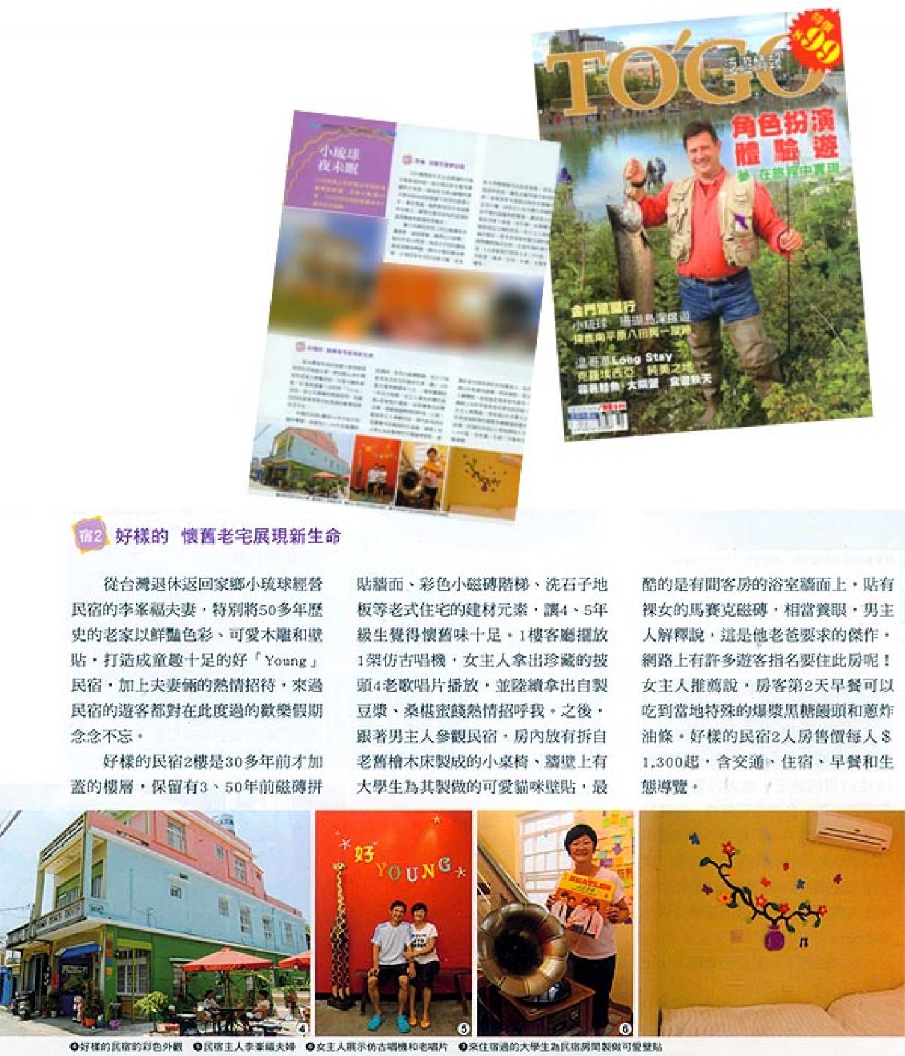 感謝2009年10月的TO'GO雜誌前來報導小琉球旅遊深度報導,其中對小琉球當地的旅遊介紹更是詳盡,推薦需入住小琉球的四家民宿業者,很榮幸好樣的民宿例為其中一家,再次謝謝TO'GO雜誌的報導及推薦。